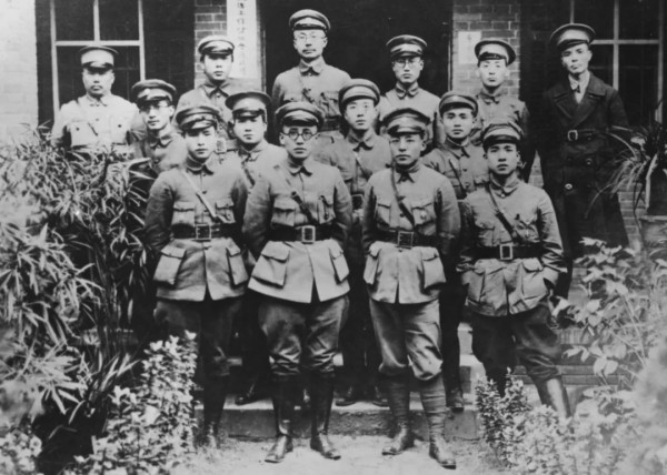 1927年春,郭沫若(前左2)在南昌与第二军副党代表李富春(前右1)、第三军党代表朱克靖(前右2)、第六军副党代表林伯渠(后右3)、总政治部秘书李一氓(后左2)等人的合影。