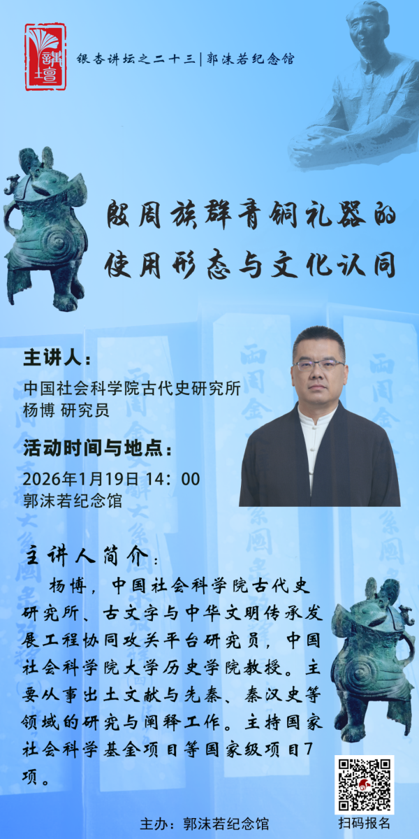 2026年1月19日下午,由郭沫若纪念馆主办的“银杏讲坛”第二十三期,特邀中国社会科学院古代史研究所杨博研究员作题为《殷周族群青铜礼器的使用形态与文化认同》的专题讲座,讲座由郭沫若纪念馆研究室李红薇副研究员主持。郭沫若纪念馆副馆长(主持工作)刘曦光,郭沫若纪念馆工作人员和社会观众20余人参加讲座。